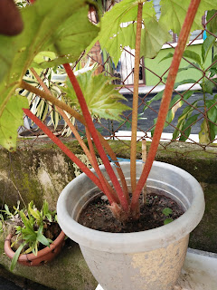 The Main Characteristics here I want to emphasise is the Yellow Green Foliage with specially the Red round furry Petioles. The leaves can grow huge and in star shaped features. This one does not have any black coloration on its leaves. The other counterpart has yellow furry petioles.